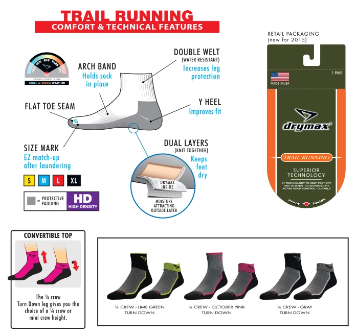 Most trail running socks are simply dark colored running socks with no specific “trail” features built-in. The Drymax Trail Running socks are the exception. To help prevent dirt from getting inside Drymax Trail socks, Drymax did not include vents. In addition, the socks’ double welted leg has extra padding around the ankle. This extra padding protects the leg, and seals the top of the shoe to keep out dirt & debris. The Dual Layer Moisture Elimination System actually removes sweat, sweat vapors, and water from the skin through the inner Drymax fiber layer to the outer absorbent layer. The double welt top is made of Drymax fibers to repel water, so when a runner splashes through a creek, the top of the socks stay dry. Drymax Trail Running Socks are a Medium + Density protective padded sock. Dense padding is used, as opposed to thick padding, as it protects feet without adversely affecting the fit of the shoes. The Trail Running Socks were designed for use in cool to warm conditions, keeping feet dry, comfortable and odor free all day long. Drymax’s five sock sizes fit because they were developed on special 3D shaped foot models. Each size sock includes a (S, M, L, XL, or XXL) color size mark for easy match-up after laundering. Construction features include seamless insides and an instep-hugging arch band. MicroZap antimicrobial in the Drymax Fibers fights odor-causing bacteria, helping keep socks odor free. Not a topical treatment; MicroZap is molecularly infused into Drymax fibers. Being non-migratory and non-toxic, MicroZap provides long term Active Odor Control. Content: 65% – Drymax/Olefin 20% – Polyester 8% – Nylon 7% – Elastaine. Sizing (Shoe Size): S: 3.5-5.5 (Men’s), 5-7 (Women’s); M: 6-8 (Men’s), 7.5-9.5 (Women’s); L: 8.5-10.5 (Men’s), 10-12 (Women’s); XL: 11-13 (Men’s), 12+ (Women’s); XXL: 13.5-16 (Men’s).
